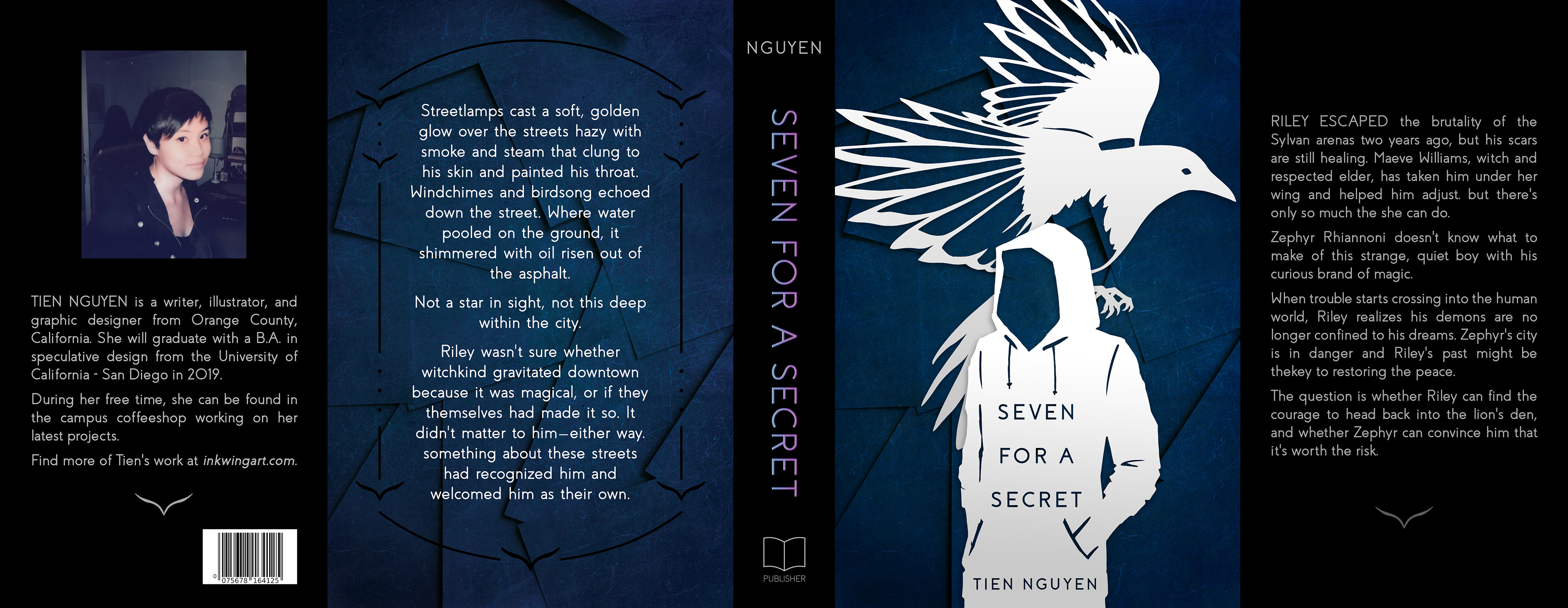 I kept the framing black on the back cover to add visual interest without distracting from the text, and to increase the overall readability. For the spine, I mocked-up the title in a holographic foil that echoes a magpie's characteristic iridescent feathers.